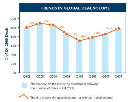 The trend in the market had been up. Intralinks produces an excellent report each quarter (‘Deal Flow Indicator‘) which looks at these trends. They noted the strength of the market in the fourth quarter of 2009, driven largely by the following factors (taken with their permission verbatim from their fourth quarter report, issued in mid January):