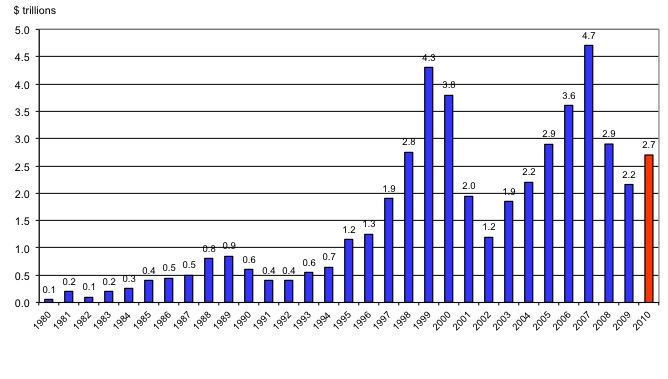 What is notable about 2011 as we start the year is the uptick in confidence (note my own blog on the importance of business confidence in the M&A cycle: ‘Why you should do an M&A deal now‘). There is increased activity as well from private equity firms and large cash hoards in corporations (which in the past have been used to do deals). I continue to hear anecdotally from people working in the M&A industry that they are very busy, and I know that many of the largest advisors are seeking new employees. (I can tell you that my own unofficial statistic on this is from the requests that I receive from banks looking for new entry-level employees who are recent graduates of my own M&A class at Cass Business School.)